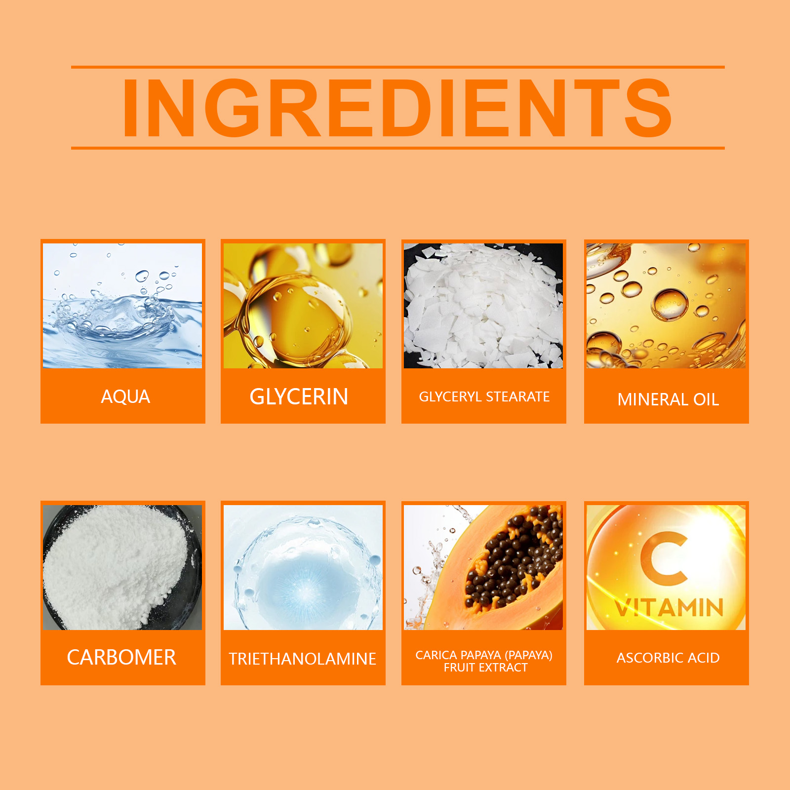 Our papaya facial cream contains day cream: papaya fruit extract, ascorbic acid (vitamin C); Night cream: papaya fruit extract, niacinamide. It can help even out the complexion and make the skin glow. Long-term use helps to reduce spots and return the skin to an even and bright state. Its application is simple: clean your face in the morning and keep it dry. Take a suitable amount of day cream and apply it evenly to your face. Massage gently to fully absorb. Cleanse your face at night and keep it dry. Apply appropriate amount of night cream to face evenly. Massage gently to fully absorb. It can also make your skin look brighter, more transparent and more radiant.